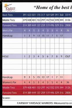 スコアカード記入面は、ホール番号、ハンディキャップ、各ティーマークからの距離やパーが、グラデーション調の色彩になっていて、きれいです。1つの面は、広告。