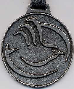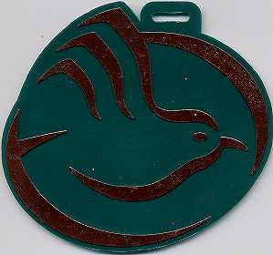 ロゴマークの形状の楕円形で、緑色のプラスチック製のタグ。
