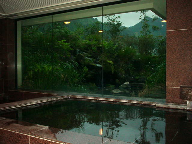 窓の外には、日本を意識してか?竹やぶ調のちょろちょろとした小木や小さな滝が流れていて、庭園風になっています。