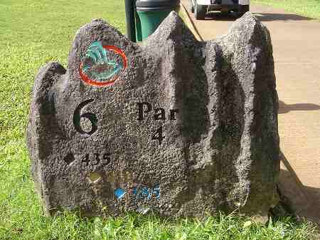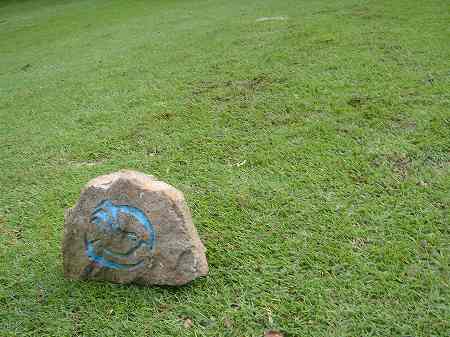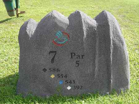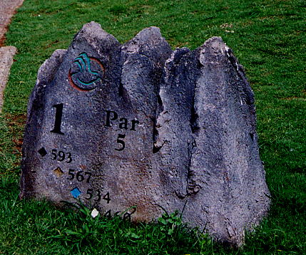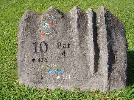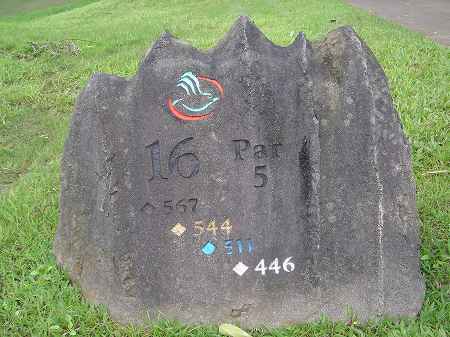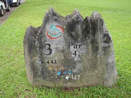 各ホールのティーグランドには、山の形をした石でできた、ホール案内板があります。