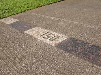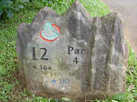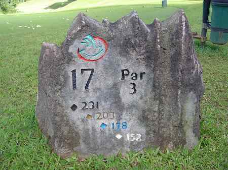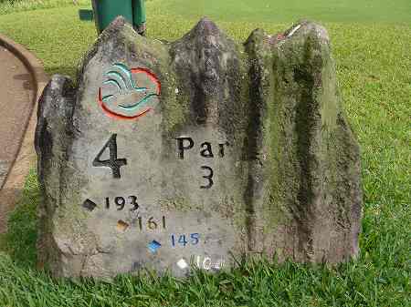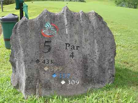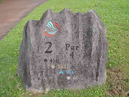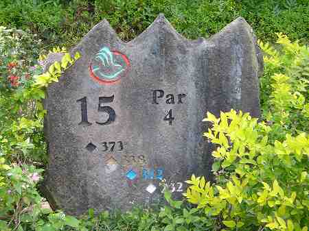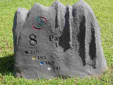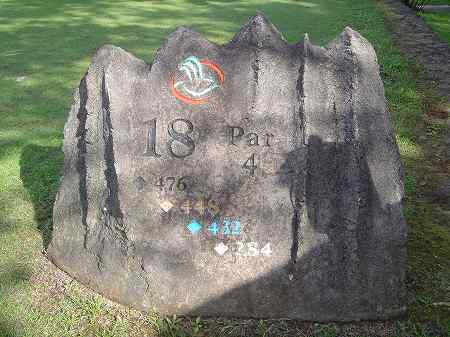 ロゴマークに、 ホール番号、各ティーからの距離、パー彫られています。