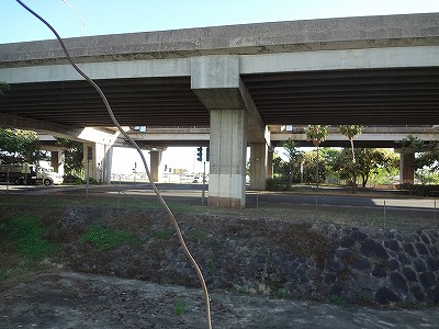海は、ホノルル空港にあり、「H1」ハイウェイの高架の方向。