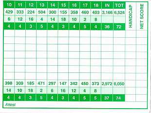 横長のスコアカードで、折るとプレーヤー名記入欄がはみ出すタイプ。