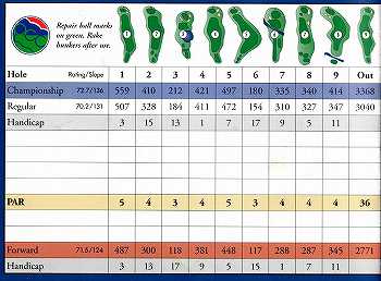 スコア記入面上部にも、各ホールの簡易レイアウト記載。