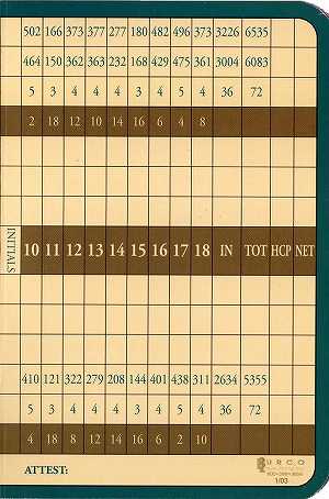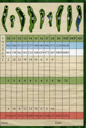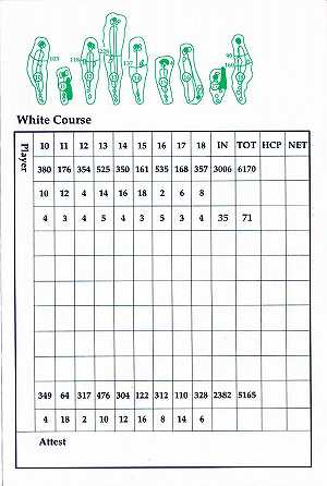 1周目がレッドのティーマークから、2周目がホワイトのティーマークからプレーする方式のため、「スコアカード」の1〜9番がレッドコース、10〜18番が「ホワイトコース」となっていて、各ホールとトータル距離が若干距離が異なっています。