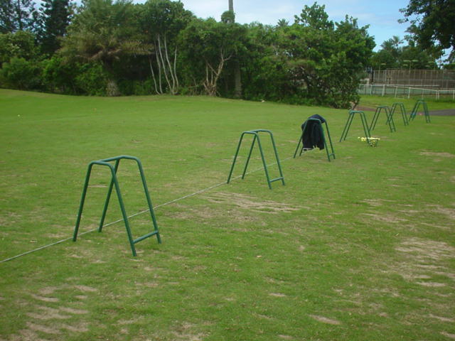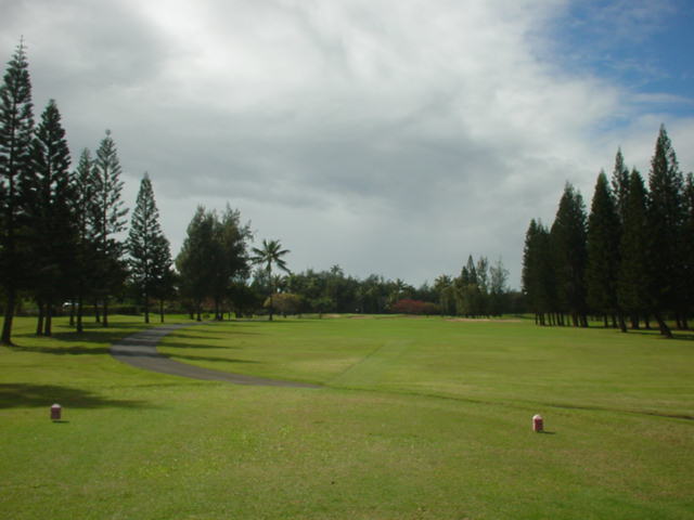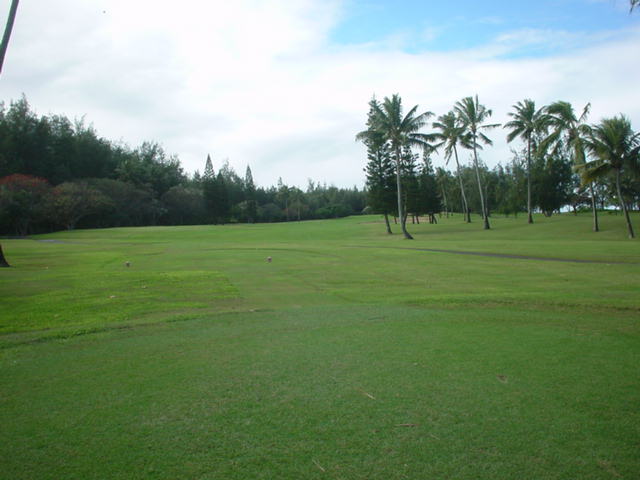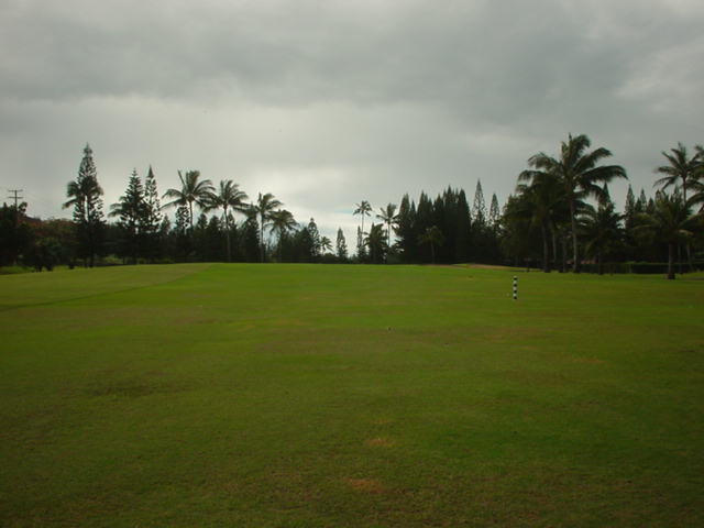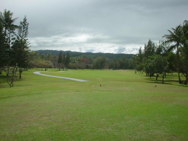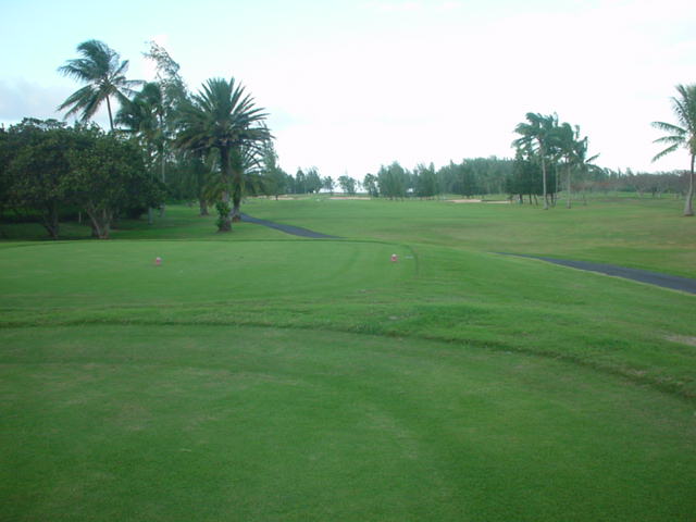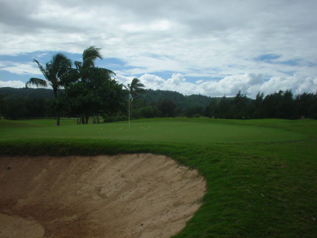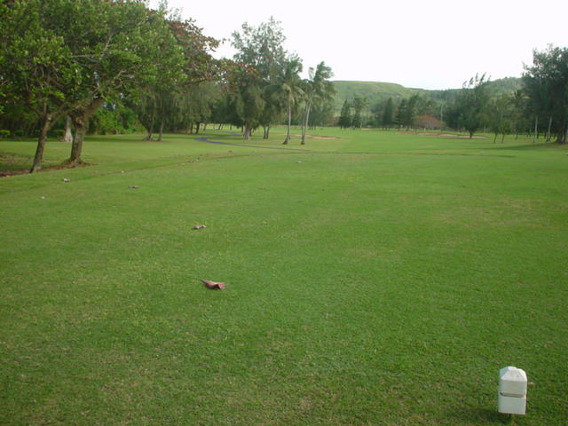 スターターから、「レッドコースをまわれ」と言われたのですが、そんなことを知らずにスタートしたRYOは(後でスコアカードをよく見ると英語で書いてありましたが・・・)、最初のホールで、レッドのティーマークが20ヤードくらい前方にあるので、当然それは、レディースティーだと思い、ホワイトから打ちました。グリーンのそばまで行くと、なんと、1つのグリーンに2本のピンがあるのでビックリ!