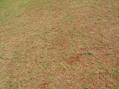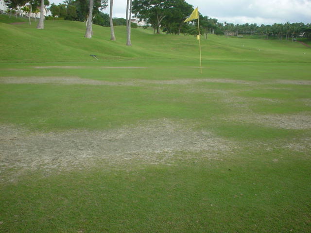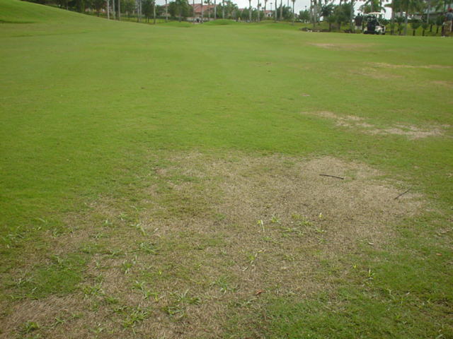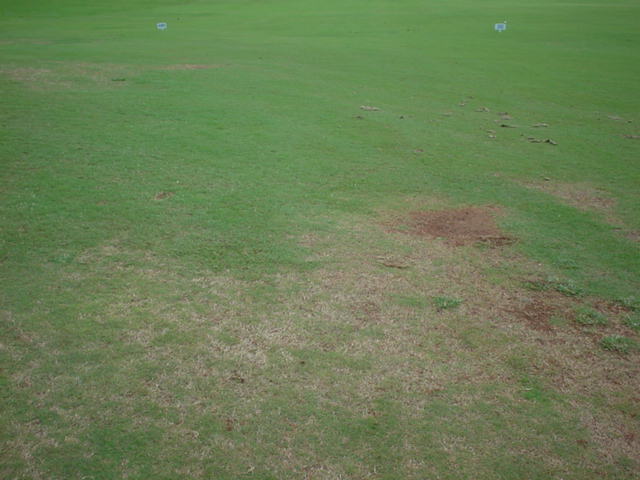 フェアウェイは、芝がハゲているところ、ベアグランド、ディボット跡だらけ。